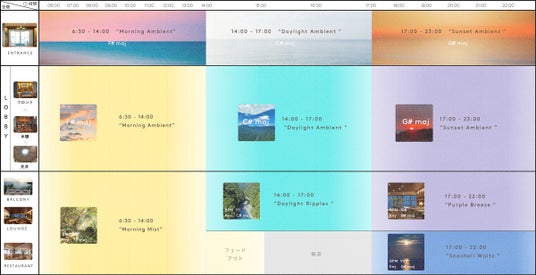 屋久島の豊かで美しい自然の「色」と「音」から紡ぎ出した、「人と自然」「目に見えるモノと見えないモノ」の境界線が溶け合うサウンドが、ホテルの空間を演出します。サウンドの制作にあたり、屋久島の雄大な自然の写真たちから色彩を抽出してMIDI 信号に変換したり、レコーダーに収めた自然界の音を使用することでリズムを制作しました。samana hotel Yakushimaで流れるサウンドは「Made In Yakushima の音」が基調になっています。時間帯に沿ってサウンドのテイストとテンポはスムーズに移ろい、またスピーカーごとに異なる音源を再生させることでサウンドが重畳的に協奏します。いつでもフレッシュで聞き飽きることのない、屋久島の自然に包みこまれるようなサウンドデザインを実現しました。