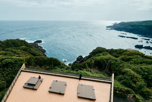切り立つ崖の上にあるテラスです。目の前に広がる大海原、振り向くとモッチョム岳、空と海を美しく染めるサンセット、満天の星など、どこを見ても絶景であり、屋久島の自然にのみ込まれるような体験ができます。寝転がって絶景を全身に浴びることができる大型ベンチをご用意しています。