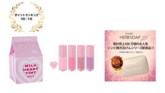 画像左より・ミルクハートティント&チーク・シンビハーブソープ