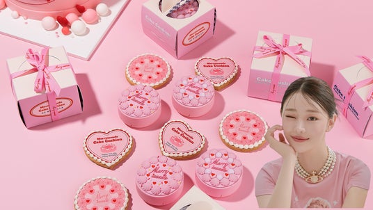 画像左より時計まわり・ミルクハートティント&チーク・チェリーハートメガティント・ハッピーユアデイクッション・スーパートゥイムペンアイライナー・グリッター