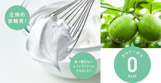 砂糖を使用せず、カロリーゼロでありながら砂糖と同じ甘さを持つ自然派甘味料「ラカント」を配合。ウリ科の植物「羅漢果(ラカンカ)」の高純度エキスと、天然甘味料成分である「エリスリトール」を絶妙なバランスで組み合わせ、砂糖に近い甘さを実現しました。さっぱりとした軽い口当たりで、最後まで食べ飽きない低糖質ホイップクリームです。
