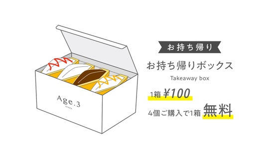 テイクアウト用のお持ち帰りボックスも準備していますので、荷物がいっぱいのときやこぼれやすい商品も安心してお持ち帰りいただけます。4個ご購入につき1箱無料です。