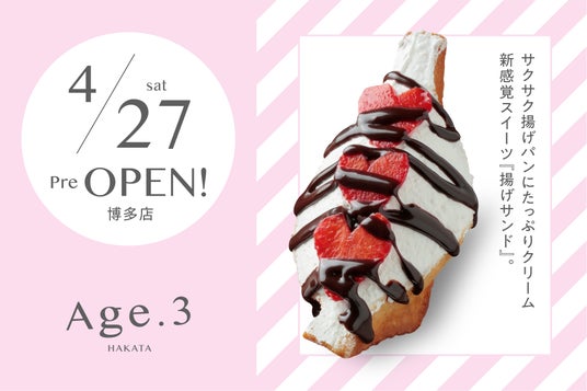 新感覚スイーツ『揚げサンド』専門店「Age.3(アゲサン)」の2号店となる「Age.3 HAKATA(アゲサン博多)」が4月27日プレオープンします。店頭販売限定だからできる、外はサクッ、中はもっちりとした新しい食感の『揚げサンド』。グランドオープンより一足先に味わうチャンスです。ぜひお越しください。