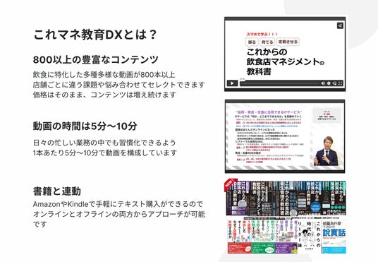 一般社団法人これからの時代の・飲食店マネジメント協会(略称:これマネ)は飲食店専門eラーニングプラットフォーム【これマネ教育DX】を教育事業者や飲食事業者へ提供しています。飲食に特化した多種多様な動画コンテンツを、現在約800本以上取り揃えているため、店舗ごとに違う課題や悩みに合わせた動画を提供し効率的なオンラインマネジメントの実現に取り組んでいます。