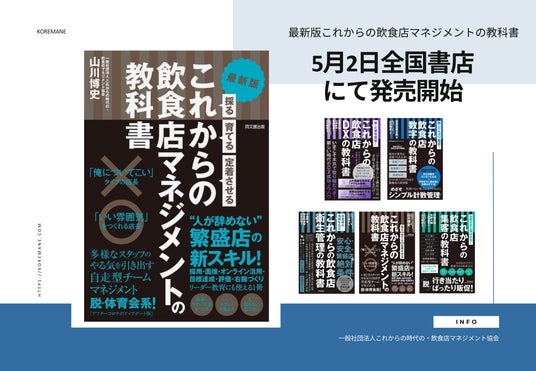 Amazon外食産業部門で「これからの飲食店マネジメントの教科書」「これからの飲食店集客の教科書」「これからの飲食店数字の教科書」「これからの飲食店衛生管理の教科書」「これからの飲食店DXの教科書」とシリーズ化され、ランキング上位を獲得しロングセラーとして多くの飲食店経営者に支持された、これマネシリーズの第一作目「これからの飲食店マネジメントの教科書」を6年ぶりに改定し、最新版として発刊いたします。