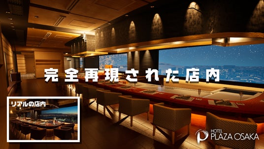 今回はホテルプラザオーサカの外観とホテル最上階のフラッグシップレストランである鉄板焼「逢坂(おうさか)」を再現。