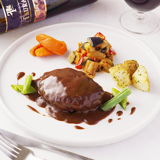 フレンチの王道「赤ワインソース」を人気の「ハンバーグ」と共に!たっぷり使用した赤ワインの風味、フォンドヴォーの旨み、バターのまろやかなコクを口いっぱいにお楽しみください。