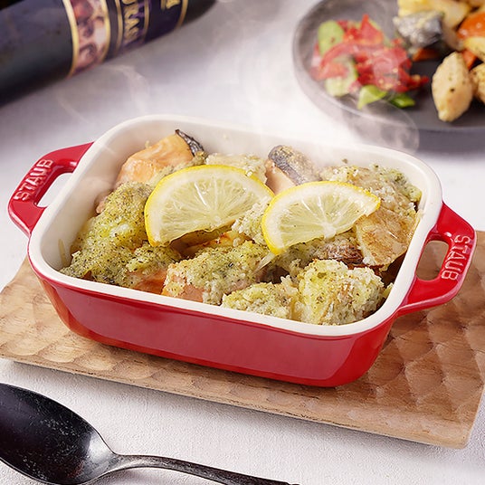 相性抜群のサーモンとじゃがいもを使ったオーブン焼き!清涼感のあるハーブ「エストラゴン」を生地に練りこみ、さわやかな仕立てです。レモンの香りと一緒にお召し上がりください。