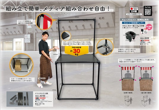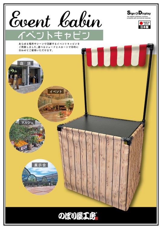 「イベントキャビン」とは、イベント会場や商業施設などで幅広く活躍する言わば”机”です!イベント会場によくある長机では雰囲気が出せない!いい感じに商品をディスプレイしてアピールしたい!そういうお悩みを解消できるキャビネットです。専用のシェードやスカート、その他装飾でオリジナリティを演出することができるので、オンリーワンの”販促場所”を作ることができます。