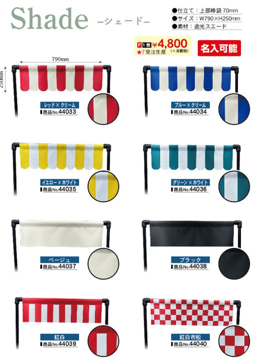 お客様のイメージに合わせた別注デザイン作成できます。シェードの形状も用途に合わせておつくりいただけます。イベントキャビン用オリジナル背景バナーも承っておりますのでお気軽にご相談ください。