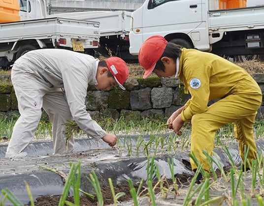 津奈木小のみんなで協力して苗植えから草取り、収穫、出荷まで行っています。