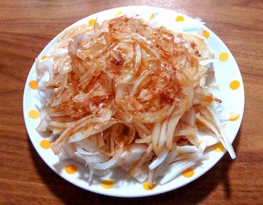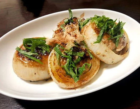 「サラ玉リングステーキ」厚めに切ったサラ玉をじっくり焼いて、芦北町のデコぽん酢をソースに使い、さっぱりした味わいです。サラ玉は火の通りが早いので時短料理をしたい人にもおすすめです。サラたまの厚さと焼いて甘みを増したサラ玉、デコぽん酢のさっぱりした味わいがとても相性が良いです。小学5年生が一人で考えたおすすめの一品です。