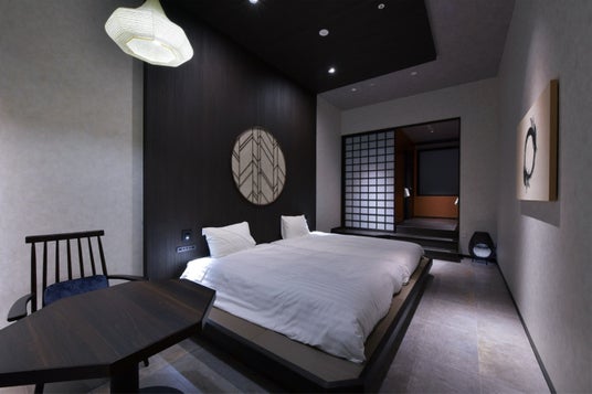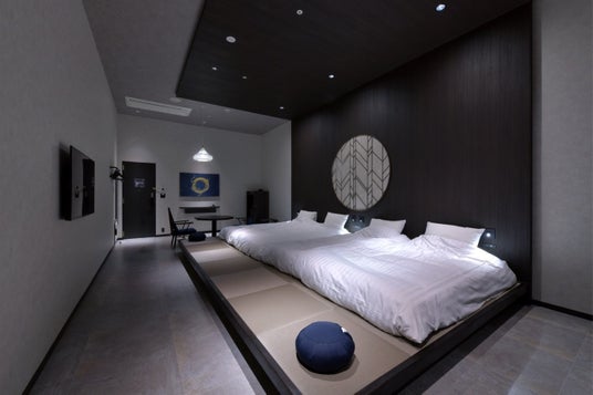 和モダンルーム(定員2~4名:シモンズ製 100cm幅ベッド4台)「禅」をテーマに掲げたコンセプトルーム。ベッドスペースに小上がりを作り、天井の造作とつなげることで、禅の教えの一つ“自己と向き合う”を表現しました。照度を抑えることで、落ち着きある雰囲気を演出。さらに元東京藝術大学非常勤講師の作家・坂爪遥氏のアート作品を配置し、クリエイティブな世界に浸りながら静かな時間を堪能できる空間に仕上げました。客室 キングサイズルーム(22~26平方メートル 8室)