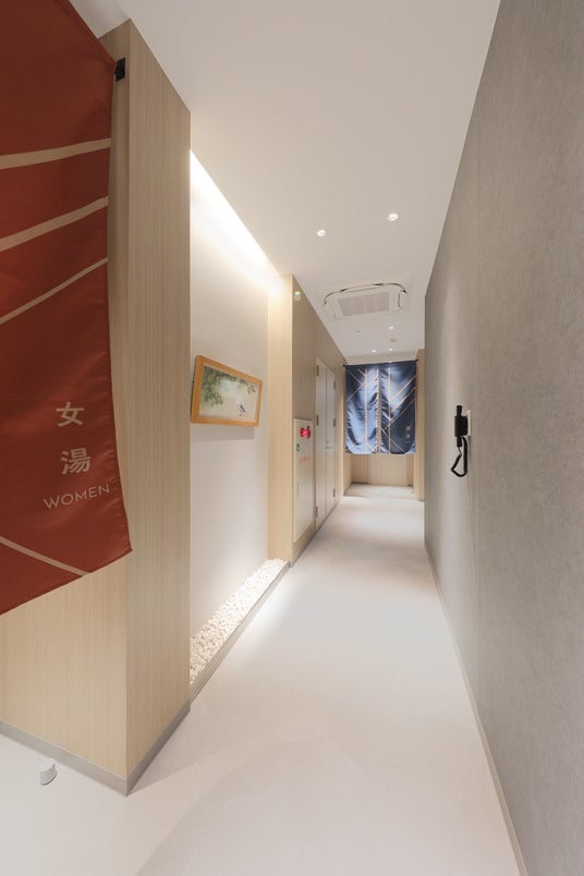 ご宿泊のお客様限定の人工温泉大浴場を新設。地域の方々にもお風呂を目的にご宿泊いただけるよう、SPAのような開放感ある空間を目指し、10~15名収容可能な広々としたスペースを確保しました。湯船はあえて中央に設置することで存在感を強調。デザインには「禅」のイメージを持たせつつ、和洋のエッセンスを取り入れ、駅前であることを忘れてしまうような癒しの雰囲気を表現しました。