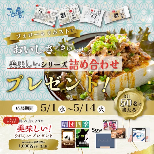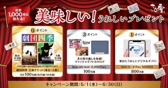 四国化工機株式会社のグループ会社である、さとの雪食品株式会社(徳島県鳴門市大津町、代表取締役社長:植田滋)は、対象商品を購入したレシートでポイントをためて応募すると、劇団四季公演チケットやギフトカタログ、QUOカードPayが抽選で当たる、さとの雪「美味しい!うれしいプレゼントキャンペーン」を2024年5月1日より開催いたします。