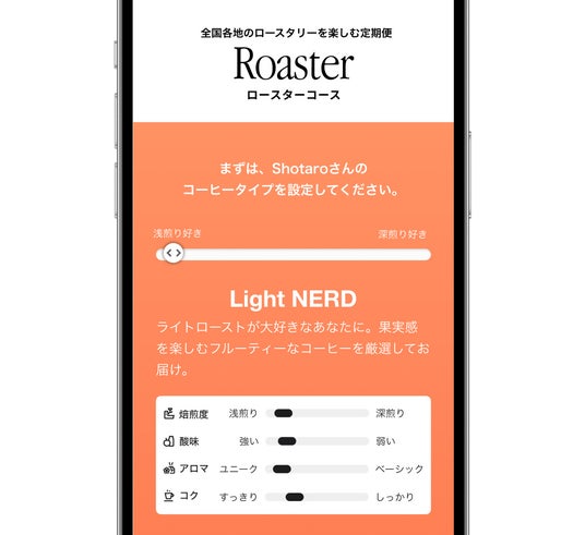 スライダーを動かして好みの焙煎度を設定ことでお届けするコーヒーの傾向を調整することができます。