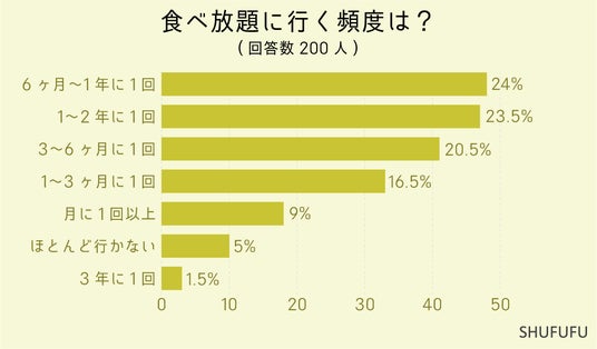 食べ放題に行く頻度は?の問いに対して最も多かったのが「6ヶ月~1年に1回(24%)」でした。 次いで「1~2年に1回(23.5%)」「3~6ヶ月に1回(20.5%)」という結果でした。