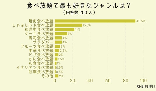 食べ放題で最も好きなジャンルに関しては1位「焼肉食べ放題(45.5%)」、2位「しゃぶしゃぶ食べ放題(15.5%)」でした。1位の焼き肉は、2位の約3倍もの差をつけて圧倒的に支持されていました。
