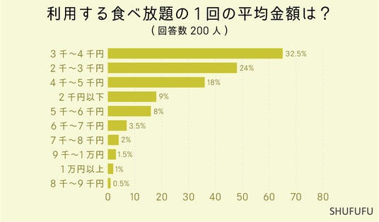 利用する食べ放題の1回の平均金額を尋ねたところ、1位は「3千~4千円(32.5%)」、2位「2千~3千円(24%)」となりました。食べ放題ジャンル1位の「焼肉食べ放題」で名前が上がっていた「焼肉きんぐ」や「牛角」のメインコースも「3千~4千円」でした。