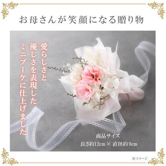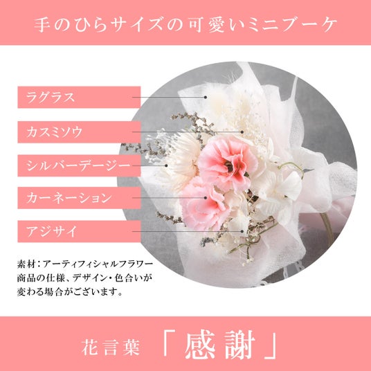 愛らしさと優しさを表現した可愛いミニブーケ。アーティフィシャルフラワーは生花をリアルに再現した造花です。耐久性があり、飾って長くお楽しみいただけます。