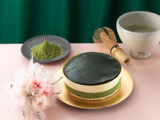 下層は抹茶のベイクドチーズケーキ。上層はレアチーズのムース。表面には抹茶のナパージュをかけ濃い抹茶の苦みを感じるチーズケーキです。
