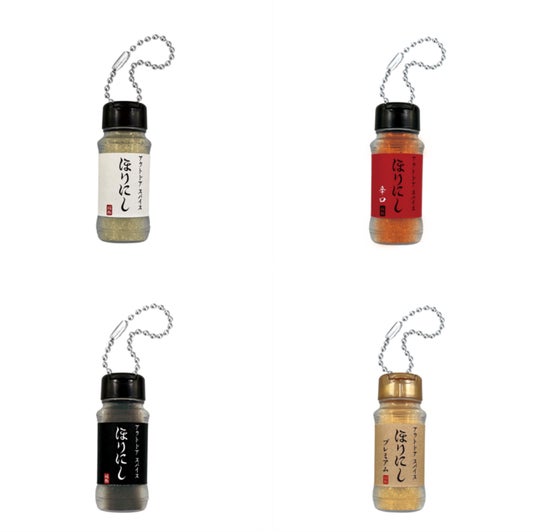 本商品は、人気のアウトドアスパイス「ほりにし」との初コラボレーションで、4種のスパイスを全高約5cmにミニチュア化した商品です。「プレーン」、「レッド」、「ブラック」「プレミアム」の全4種をラインナップ。それぞれのスパイスを砂で表現し、蓋の開閉ギミックも付与したこだわりのチャームとなっています。