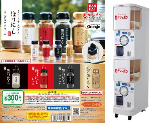 アウトドアショップ「Orange」(オレンジ)の運営や、「アウトドアスパイス ほりにし 」を販売する株式会社ミモナ(本社:和歌山県かつらぎ町、代表取締役社長:池田道夫、以下「ミモナ」)は、株式会社バンダイのガシャポンとして人気のアウトドア スパイス「ほりにし」をミニチュアチャームにした「アウトドアスパイスほりにし ミニチュアチャーム」(1回300円・税10%込、全4種)を、2024年5月第1週から順次、全国のガシャポンバンダイオフィシャルショップ、玩具売り場・量販店・家電店などに設置されたガシャポン自販機シリーズにて発売いたします。