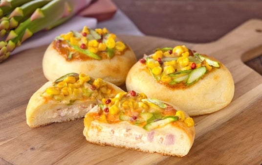 自慢のじゃがチーズパンに、北海道産のアスパラガスとコーンをトッピング