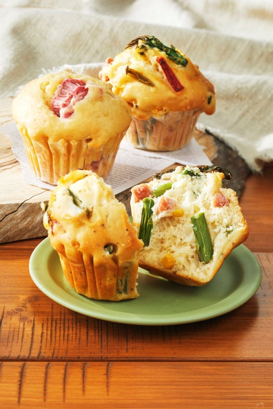 グリーンアスパラガスと厚切りベーコンたっぷりのマフィン。ルバーブ&いちご味は爽やかな風味が人気