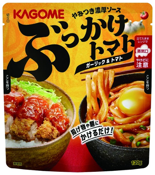 「ぶっかけトマト ガーリック&トマト」完熟トマトに焙炒にんにくやチーズなどのうま味素材をブレンドしたやみつき感のある濃厚ソースです。揚げ物や麺などにかけるだけで、ガーリックとトマトの旨味が詰まった外食で食べるようなやみつきメニューができあがります。在宅時や疲れて帰った際の手軽に済ませたい1人飯にも最適です。また、温めずにそのまま『ぶっかけ』ても美味しくお召し上がりいただけます。