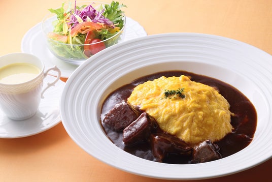 神戸ビーフを赤ワインでじっくり煮込んだ、奥深い味わいのスペシャルなオムライスに、サラダ・ミニスープもセットにしました。