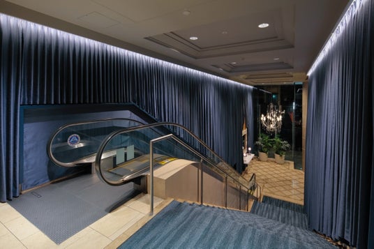 エントランスから2階フロントへ続くエスカレーターホールは、壁一面にブルーのカーテンを装飾しエレガントに演出。無数のドレープが美しい光沢を生み出し、落ち着きがありながらも優美な印象を与えています。
