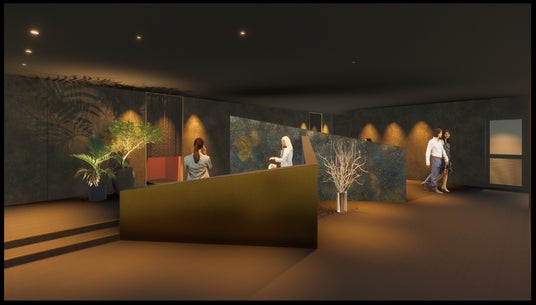 エントランスとエスカレーターホールは名古屋の繁華街、栄の中でもひときわ目を惹くよう華やかな雰囲気づくりにこだわりました。エントランス手前の外壁には名古屋のシンボルカラー、ゴールドのダイナミックなアートオブジェを設置。大きさの異なる多角形を背面から光を当てることで、空間全体を煌びやかに彩ります。エスカレーターホール