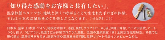 地域の職人・作家・生産者と行う界オリジナルのご当地文化体験「手業のひととき」にスポットをあてながら、日本の温泉旅が楽しくなる『界』での滞在スタイルを紹介します。本書の企画、編集・執筆を担当するのは、全国の「町・ひと・温泉・宿」を30年取材発信する旅ジャーナリスト・のかたあきこ氏。星野リゾートへの取材経験を活かし、温泉旅館や日本旅の面白さについて観光人材の取り組みを踏まえて本書籍を制作。手仕事や温泉ファンはもちろん、観光業界に興味がある方、観光関係者にもオススメしたい一冊です。