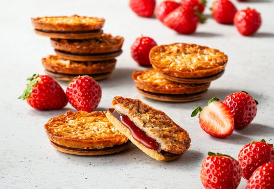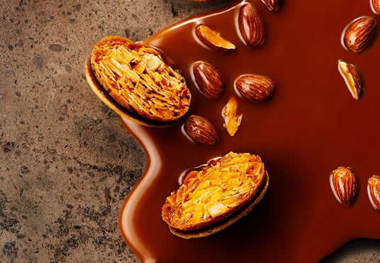 苺のソース、パウダーを合わせて炊き上げた苺キャラメルを、クーベルチュールチョコレートで包み、華やかな甘味のアーモンドフロランタンとバターサブレでサンドしました。