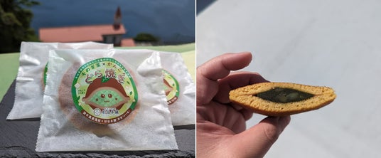 長崎にある橘湾の畔にある工場で作られた『そのぎ茶×かんころ どら焼き』。香り立つ緑茶の餡にモチっとしたかんころがいいアクセントになっています。