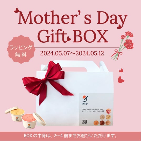 株式会社グルメ杵屋(大阪市住之江区北加賀屋三丁目4番7号、代表執行役社長:椋本 充士)が運営するGELATERIA solegeから2024年5月7日(火)~5月12日(日)まで母の日限定GIFT BOXと共に女性に人気の期間限定大人フレーバーが登場します。