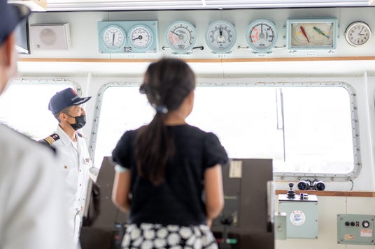 普段は入れない「操舵室」に入って、船長や航海士と一緒に船を出航させます