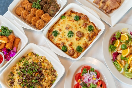 昼食タイムは保護者の方と一緒に船上レストランで食べ放題ビュッフェを。から揚げやグラタン、ステーキ、カレー、スパゲッティなど、子どもから大人まで大満足のメニューが勢揃い。