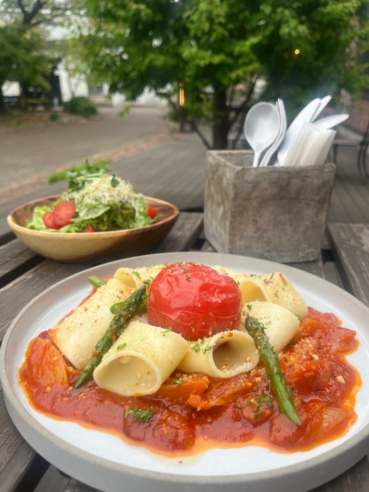 イタリアで1番太いと言われているマカロニ"パッケリ"や丁寧にローストした旬のアスパラと絡めてお楽しみください。