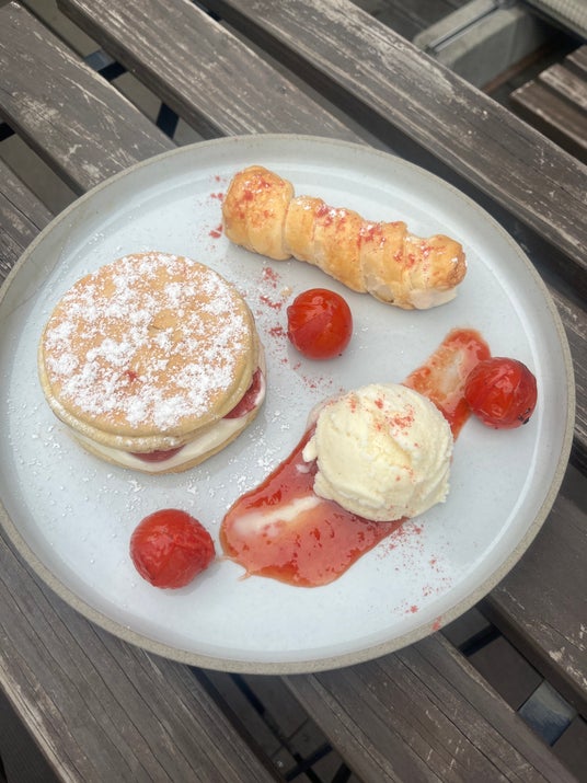 ミニトマトのコンポートやバニラアイス、サクサクとしたパイ生地の中にクリームたっぷりのコルネを添えて、食感も楽しめる1皿になりました。九州の厳選した農園から送られてきたトマトは、うまみがぎゅっと凝縮されています。