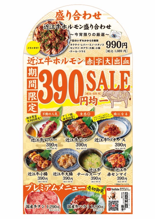 そのほかにも、〈近江牛小腸〉、〈近江牛大腸〉、〈近江牛テールスープ〉、〈近江牛赤センマイ〉が390円(税込429円)で提供されます。