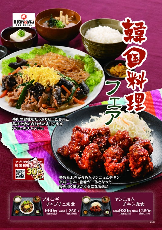 M&Sフードサービス株式会社(本社:大阪府大阪市、代表取締役社長:夏井 克典)が運営する定食チェーン「定食屋 宮本むなし」では、牛肉の旨味たっぷりな「プルコギチャプチェ定食」、後引く辛さがクセになる「ヤンニョムチキン定食」を2024年5月8日(水)より期間限定で販売開始します。