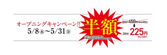 5月8日(水)~5月31日(金)までオープニングキャンペーンで30分450円(税込495円)のところ半額の30分225円(税込248円)でご利用頂けます。 (最初は60分から)