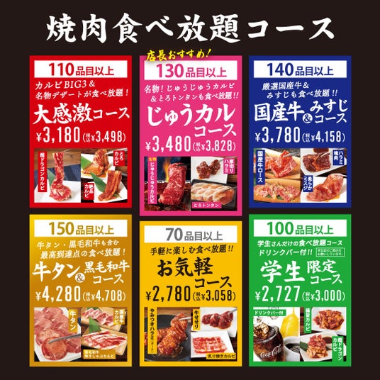 食べ放題対象コース:大感激コース、じゅうカルコース、国産牛&みすじコース、牛タン&黒毛和牛コース、学生限定コース