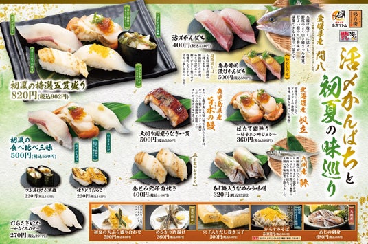 コロワイドグループの株式会社アトム(本社:神奈川県横浜市 代表取締役社長:小島保幸)は、回転寿司業態の「にぎりの徳兵衛」「海鮮アトム」「海へ」の各店で、2024年5月14日(火)から、「活〆かんぱちと初夏の味巡り」を期間限定で実施します。
