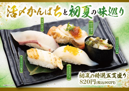 初夏のおすすめ寿司が一皿で味わえる「初夏の特選五貫盛り」税込902円