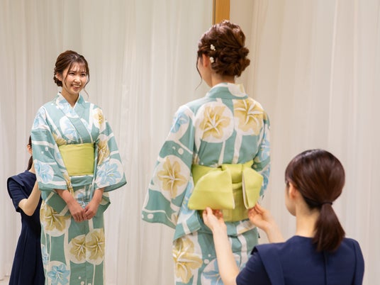 夏のハウステンボスやホテル館内を涼やかな浴衣でお過ごしいただけるよう、浴衣のレンタルと「ブライダルコスチューム スエヒロ」スタッフによる着付けをセットにした宿泊プランをご用意しました。お客様ご自身でお好みの浴衣をお選びいただけ、下駄や巾着など小物類も揃えており手ぶらで浴衣レンタルが楽しめ、女子旅やカップルでのご旅行をより一層華やかに彩ります。