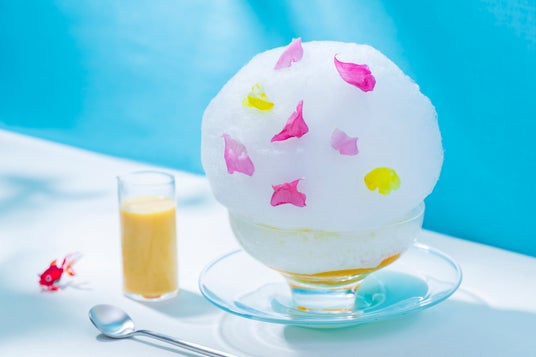 発祥の地、新世界からほど近い当ホテルでは、そんな大阪名物のミックスジュースと夏祭りの風物詩である綿あめから着想を得た「綿あめミックスジュースかき氷」を提供します。みかんのピューレをかけた桃やパインなどの果物に牛乳ベースのミルク氷を削り入れ、ふわふわの綿あめを乗せたかき氷と、バナナをベースにしたソースを提供。ソースをかけると綿あめが溶け出し甘味が程よく合わさったミックスジュース味のかき氷が完成します。