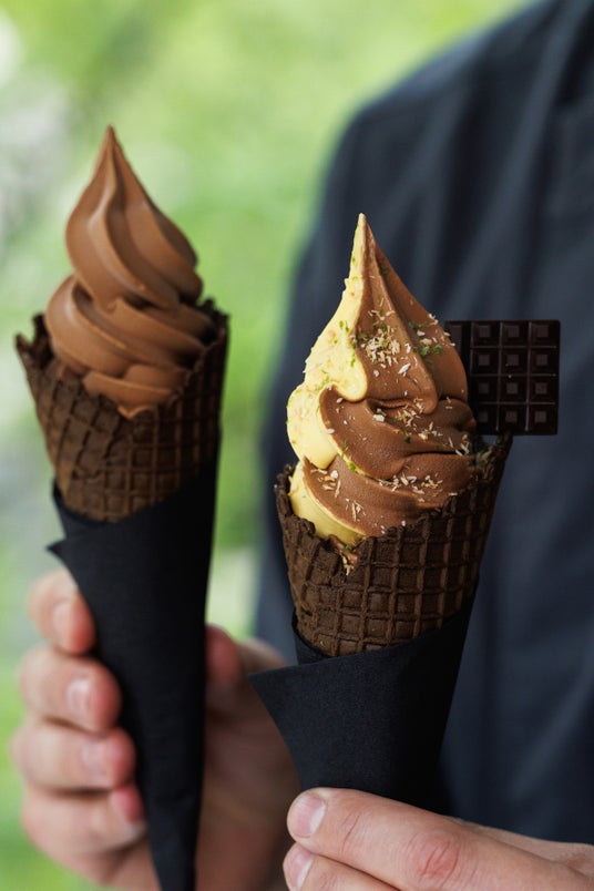 六本木店では、夏らしい爽やかな酸味広がるパッションフルーツとマンゴーをすっきりとしたカカオ感溢れるショコラと組み合わせた限定商品「ソフトクリーム ショコラ・マング・パシッション」も登場!ブランドを象徴する幾何学デザインのショコラをトッピングしています。夏に向かうこれからの季節に、「ル・ショコラ・アラン・デュカス」自慢のショコラの冷たい口どけは、けやき坂のウィンドウショッピングやデートのお供にもピッタリです。